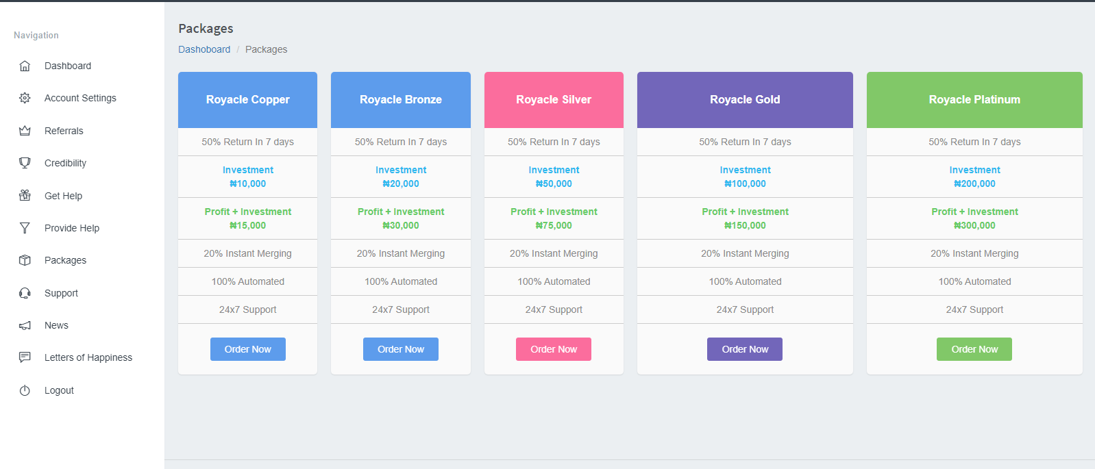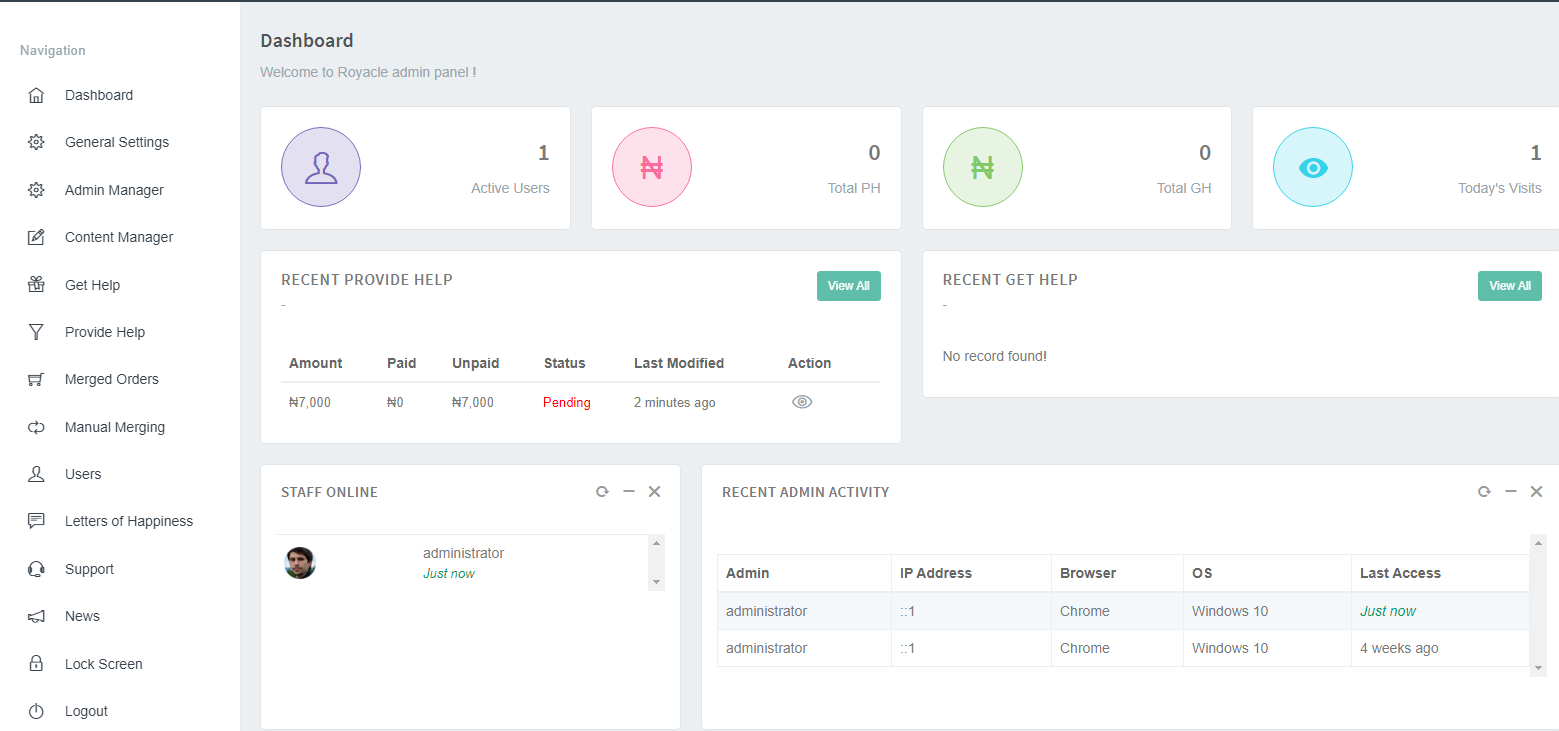 Peer to Peer donation script with recommitment This is one of the latest Peer to peer donation website application with a unique Aesthetics UI and an easy-use system. This beautiful piece is made in such a way that it is easy for everyone and anyone to Navigate without stress. Written in PHP, HTML and JavaScript programming languages, this application has the following unique features: USER DASHBOARD: 1. Complete registration and login form. 2. Working activation link after registration. 3. Easy communication option between the users and the admin 4. Users can use two different currencies (Naira and Bitcoin). 5. Anti-Hit and Run system because options are available to Upload evidence of payment 6. Different Plan options are also available. (You can create different plans) 7. Automatic deletion of newly registered user who are not active 8. Users have the option to send a testimony immediately after donating or receiving donation. 9. User credibility option is also very available. This will enhance trust. Participants with lower credibility score will be deleted 10. User also get the opportunity to cancel their PH request if they have can’t meet up Users also get the option to upload their profile images. Peer to Peer donation script with recommitment Peer to Peer donation script with recommitment ADMIN DASHBOARD: 1. Option to register a major Administrator and Sub-admins (up to 50) 2. The major admin cannot be kicked out by any other admin because He is the owner but He can kick out any of the sub-admin. 3. Dispute resolution option also present for the admin. Because all admins will have the opportunity to see all POP (Proof of Payment) based on what He sees and makes decision either to delete any user that has uploaded a fake bank teller. 4. Option to set percentage increase that will apply to all participant based on their donation 5. Purging system for inactive users after being inactive after 3days of signing up 6. Communication between Admin and Users. 7. Communication between admin and sub-admins 8. Option to broadcast news generally to all participants 9. Manual GH system to admins 10. Manual PH also for any of the Sub-admins if the Major Admin wants them to donate at all cost. 11. Option for the admin to receive payment first 12. AUTOMATIC RE-COMMITMENT OPTION FOR PH Participants. 13. Re-commitment amount cannot be less than the Initial PH it can only be equal to it or higher than it In short, this system is what you need to run a Peer to Peer donation website successfully. CONTACT US NOW TO PURCHASE